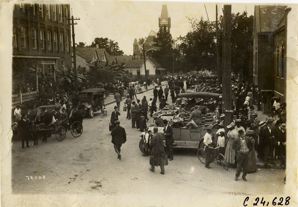 Motorists and spectators with automobiles in street, 1911 Glidden Tour