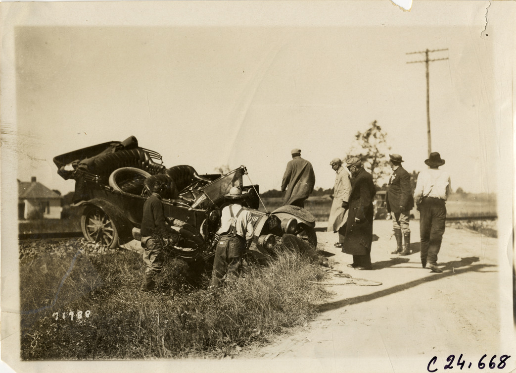 Favorite this☆ Men looking at automobile in ditch near railroad crossing, 1911 Glidden Tour Description: View of men looking at damaged car in ditch near railroad crossing during the 1911 Glidden Tour. Handwritten on back: "Tours--Glidden Tour, 1911." Details Resource ID: na025917 Subject: Automobiles--Collision damage Traffic accidents Railroad crossings Glidden Tour (1911) Automobile driving--Competitions--United States Photographic prints Date Issued: 1911-10 Format: 1 photographic print ; 5 x 7 in. Member of: National Automotive History Collection Lazarnick Collection Filing Location: Tours--Glidden Tour, 1911 #15 Negative Number: Negative #C24,668 Rights: Physical rights are retained by DPL. Copyright is retained in accordance with U.S. copyright laws.