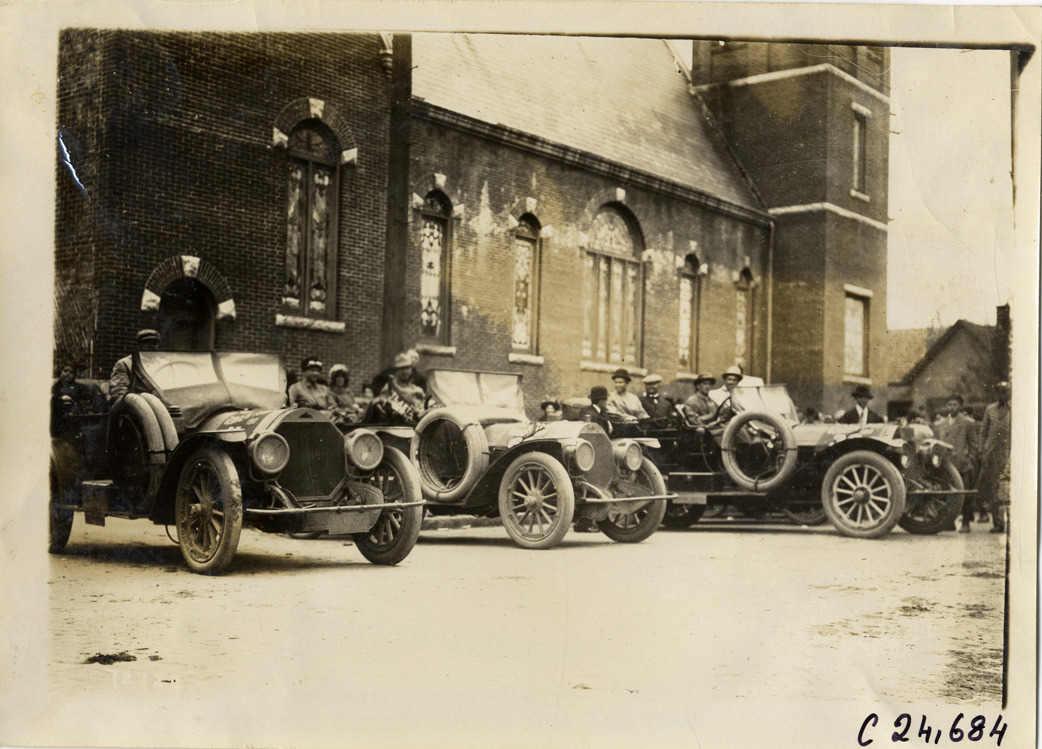 Motorists in Stevens-Duryea automobiles parked in front of church, 1911 Glidden Tour
