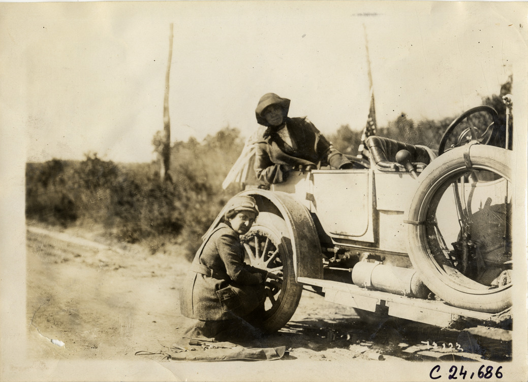 View of Roberta "Birdie" Marks changing tire on Columbia car during the 1911 Glidden Tour. Woman passenger leans over side of car. Stamped on back: "Spooner & Wells, Inc., photographers, telephones 3472-3473 Columbus, 1931 Broadway, New York." Handwritten on back: "Miss Birdie Marks, Athens, Ga. [undecipherable] Tours--Glidden Tour, 1911."