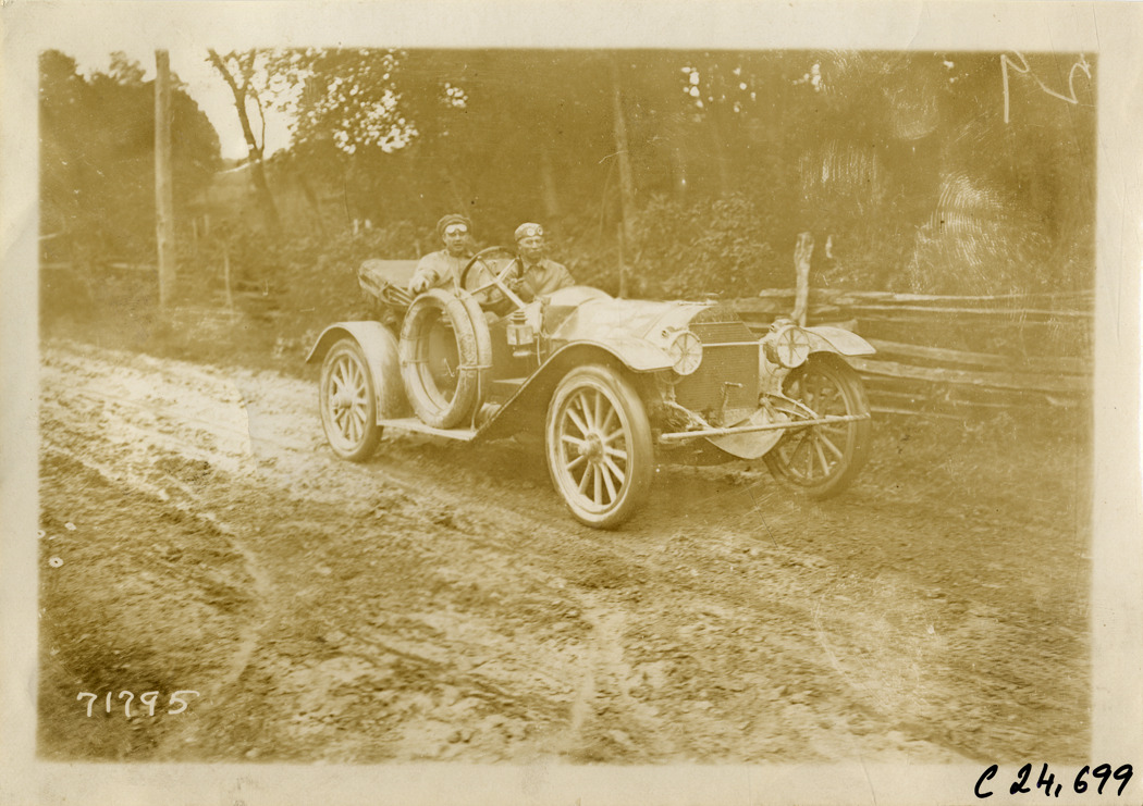 View of motorists in car traveling on muddy rural road near Roanoke, Virginia during the 1911 Glidden Tour. Stamped on back: "Spooner & Wells, Inc., photographers, telephones 3472-3473 Columbus, 1931 Broadway, New York." Handwritten on back: "Tours--Glidden Tour, 1911."