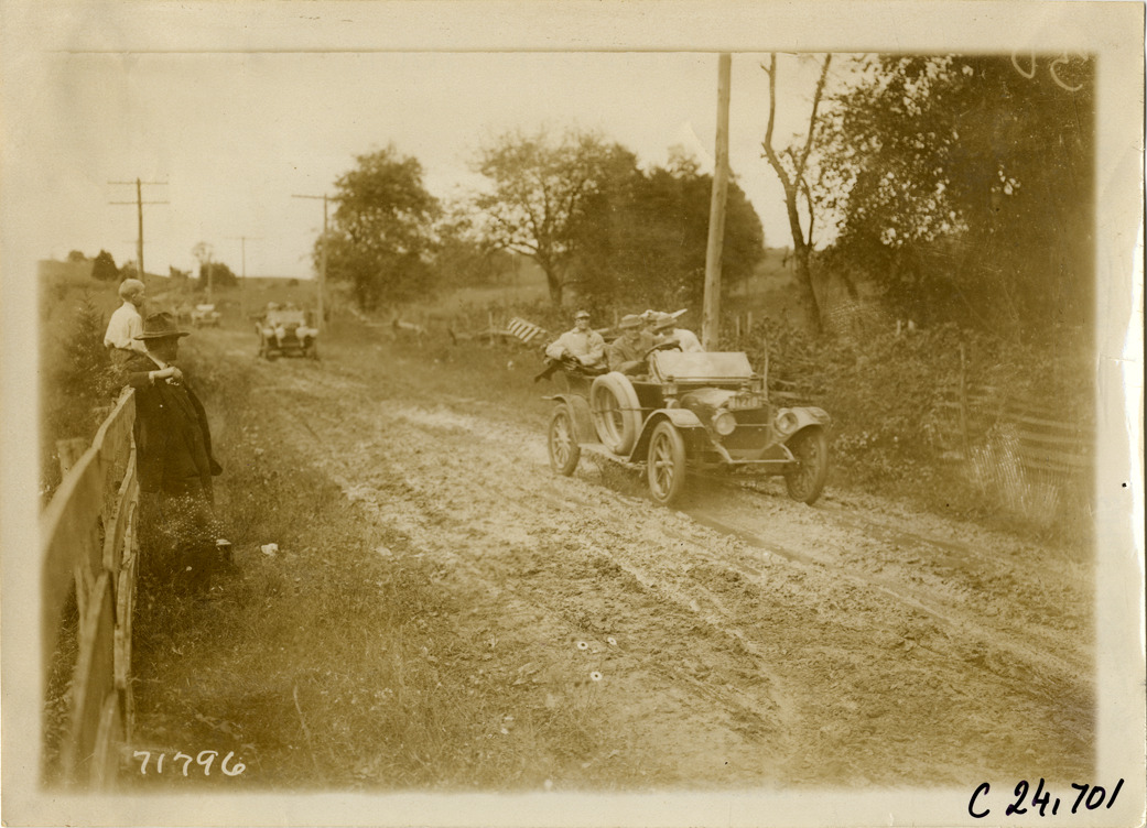 Motorists in automobiles traveling on muddy rural road near Roanoke, Virginia, 1911 Glidden Tour