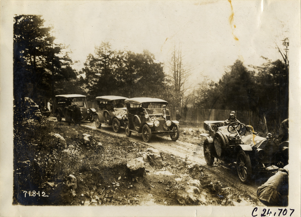 View of motorists in cars lined up on narrow dirt road during the 1911 Glidden Tour. Stamped on back: "Spooner & Wells, Inc., photographers, telephones 3472-3473 Columbus, 1931 Broadway, New York." Handwritten on back: "Tours--Glidden Tour, 1911."