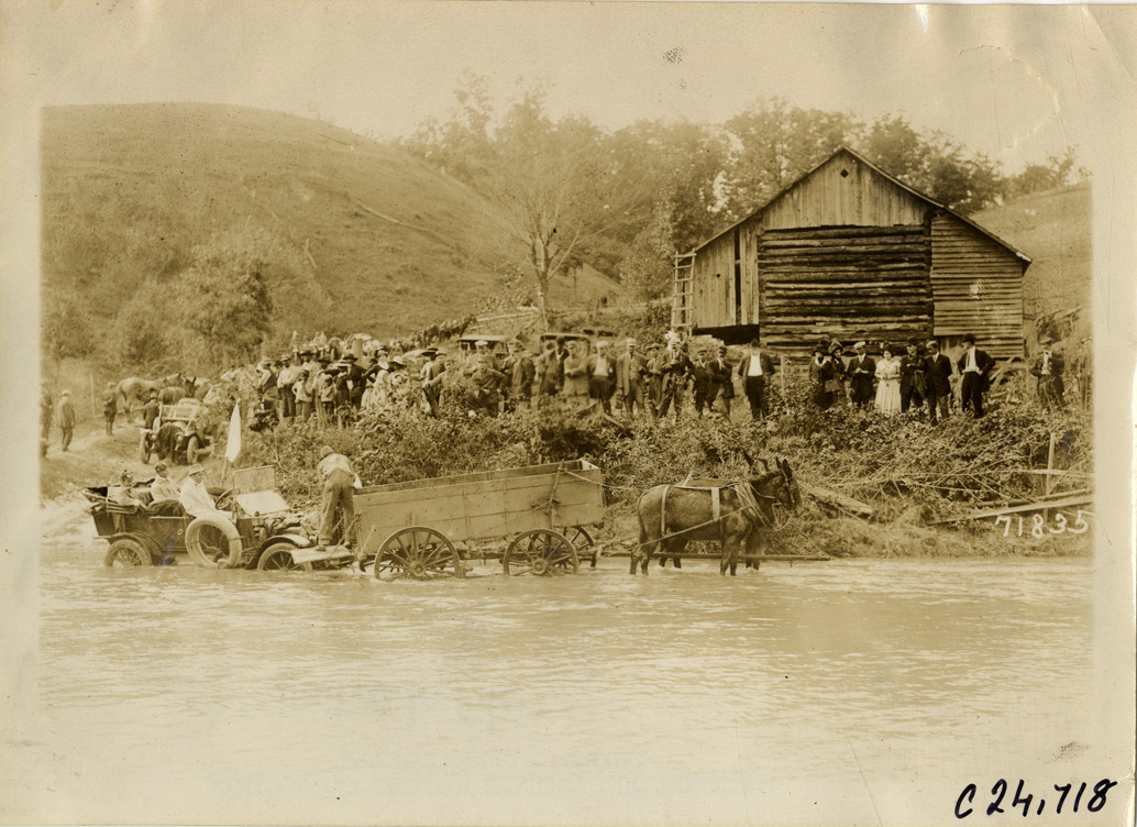 View of mule-drawn wagon towing car across Back Creek near Roanoke, Virginia during the 1911 Glidden Tour. Spectators and barn on riverbank in background. Stamped on back: "Spooner & Wells, Inc., photographers, telephones 3472-3473 Columbus, 1931 Broadway, New York." Handwritten on back: "Tours--Glidden Tour, 1911."