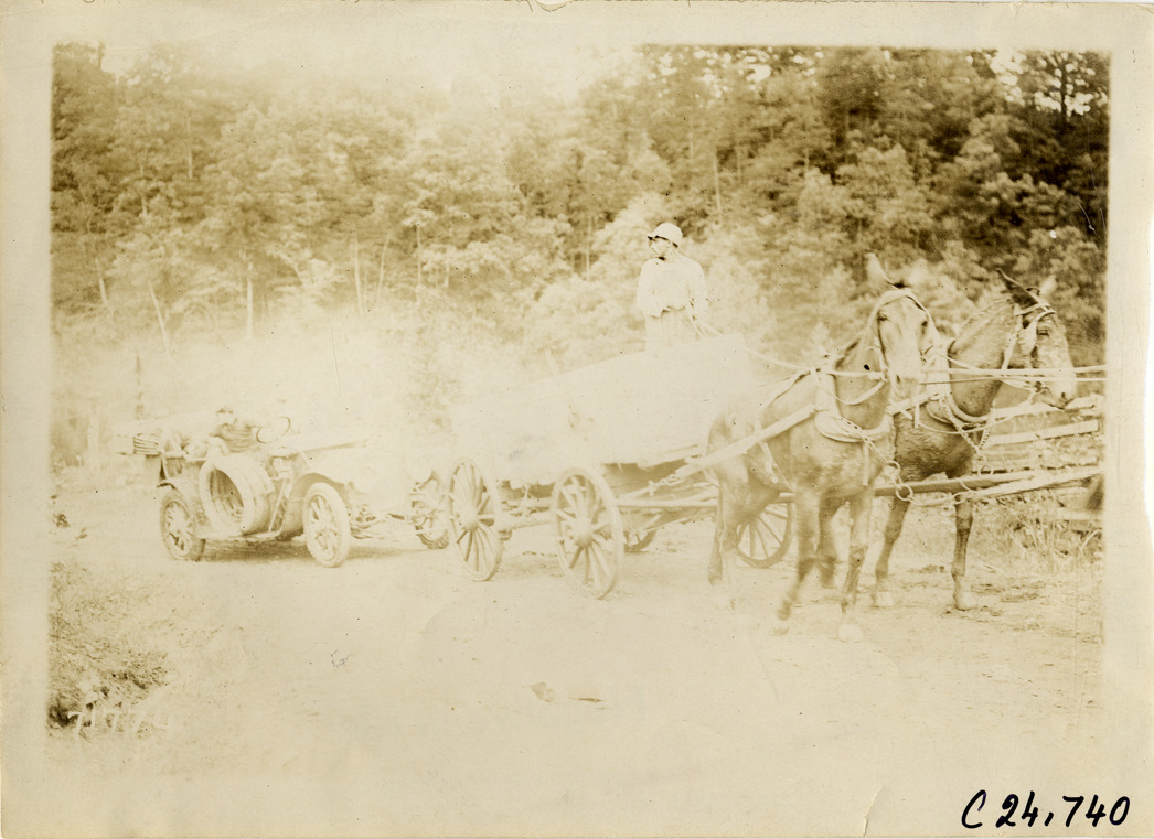View of mule-drawn wagon towing car near Roanoke, Virginia during the 1911 Glidden Tour. Stamped on back: "Spooner & Wells, Inc., photographers, telephones 3472-3473 Columbus, 1931 Broadway, New York." Handwritten on back: "Tours--Glidden Tour, 1911."