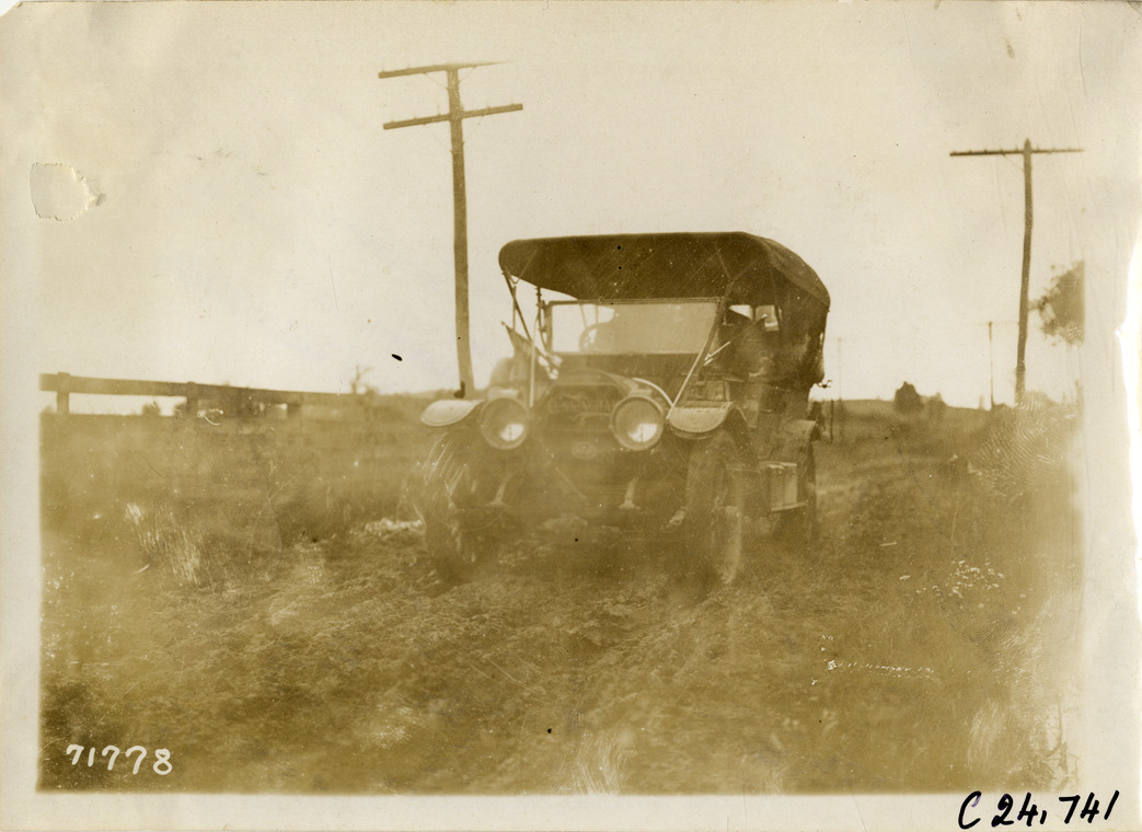 Automobile traveling on muddy rural road, 1911 Glidden Tour