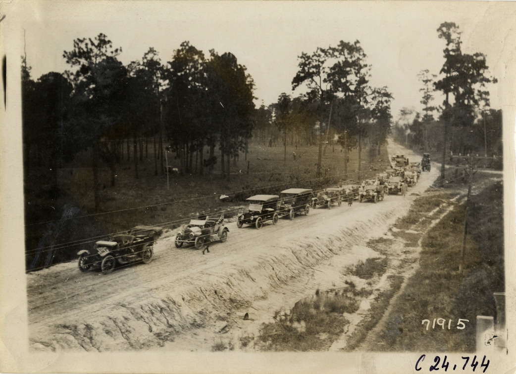 Distant view of cars lined up on rural dirt road near scene of accident involving Cunningham automobile during the 1911 Glidden Tour. Stamped on back: "Spooner & Wells, Inc., photographers, telephones 3472-3473 Columbus, 1931 Broadway, New York." Handwritten on back: "Tours--Glidden Tour, 1911."