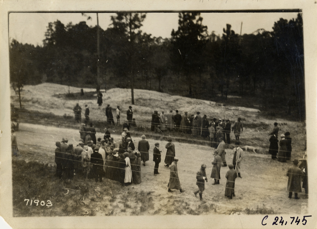 Distant view of motorists gathered in road near scene of accident involving Cunningham referee car during the 1911 Glidden Tour. Chairman Samuel M. Butler was killed in the crash. Stamped on back: "Spooner & Wells, Inc., photographers, telephones 3472-3473 Columbus, 1931 Broadway, New York." Handwritten on back: "Tours--Glidden Tour, 1911."