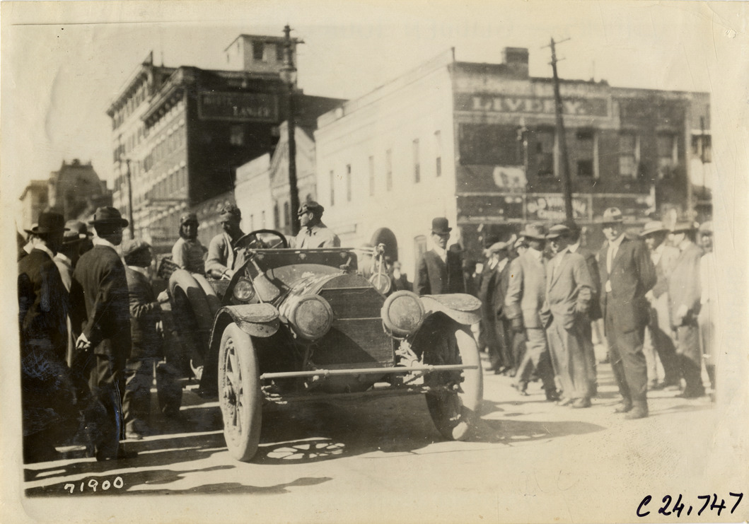 View of motorists in car, surrounded by spectators, at Macon, Georgia during the 1911 Glidden Tour. Hotel Lanier and other commercial buildings in background. Stamped on back: "Spooner & Wells, Inc., photographers, telephones 3472-3473 Columbus, 1931 Broadway, New York." Handwritten on back: "Tours--Glidden Tour, 1911."
