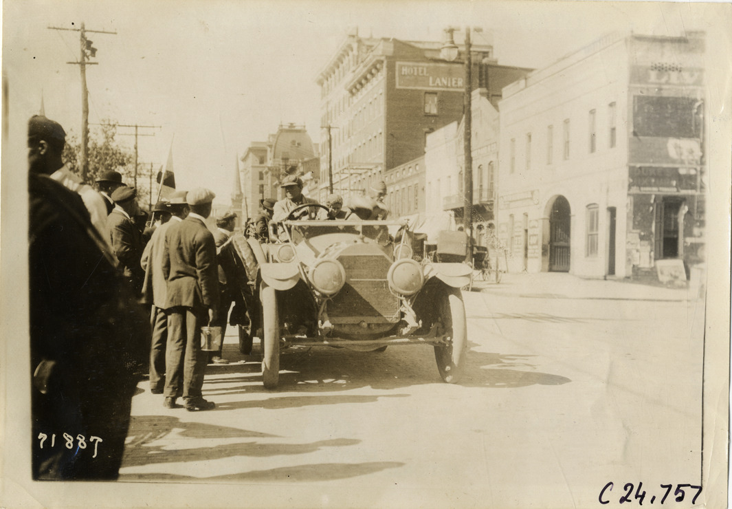 View of motorists in car, surrounded by spectators, at Macon, Georgia during the 1911 Glidden Tour. Hotel Lanier and other commercial buildings in background. Stamped on back: "Spooner & Wells, Inc., photographers, telephones 3472-3473 Columbus, 1931 Broadway, New York." Handwritten on back: "Tours--Glidden Tour, 1911."