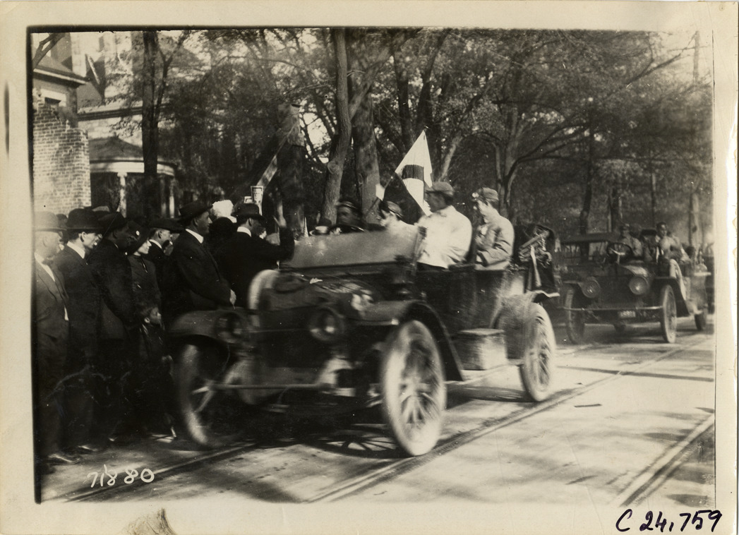 Motorists in automobile passing spectators on sidewalk, 1911 Glidden Tour