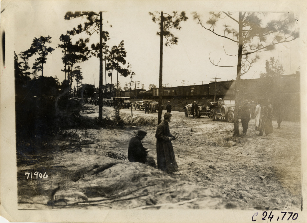 Distant view of motorists and cars in road near scene of accident involving Cunningham referee car during the 1911 Glidden Tour. Chairman Samuel M. Butler was killed in the crash. Railroad freight cars on tracks in background. Two motorists on roadside in foreground. Stamped on back: "Spooner & Wells, Inc., photographers, telephones 3472-3473 Columbus, 1931 Broadway, New York." Handwritten on back: "Tours--Glidden Tour, 1911."