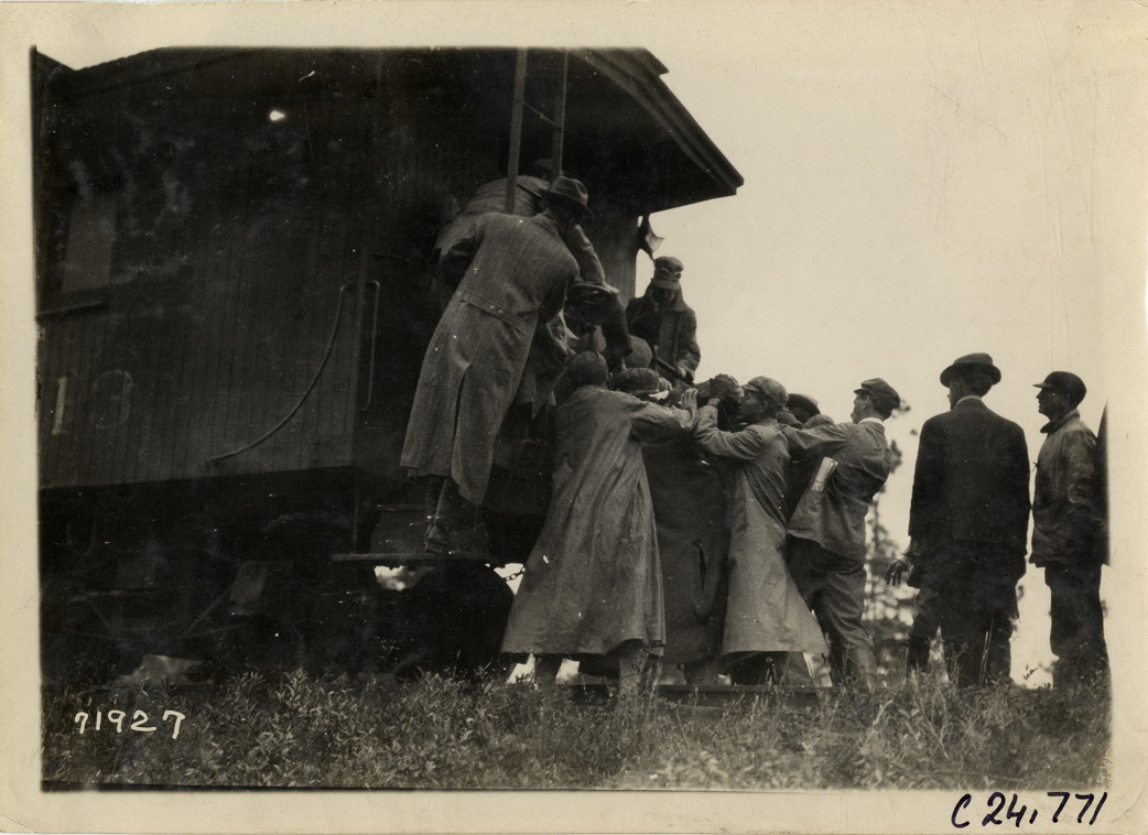Men lifting injured motorist into caboose, 1911 Glidden Tour