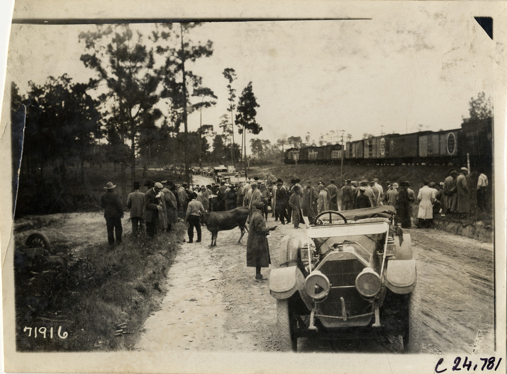 Distant view of motorists gathered in road near scene of accident involving Cunningham referee car during the 1911 Glidden Tour. Cow stands in middle of road; car in foreground; railroad freight cars in background. Chairman Samuel M. Butler was killed in the crash. Stamped on back: "Spooner & Wells, Inc., photographers, telephones 3472-3473 Columbus, 1931 Broadway, New York." Handwritten on back: "Tours--Glidden Tour, 1911."