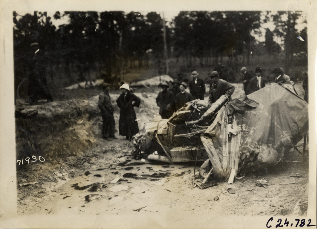 Close-up view of men and women looking at damaged Cunningham referee car in ditch during the 1911 Glidden Tour. Chairman Samuel M. Butler was killed in the crash. Stamped on back: "Spooner & Wells, Inc., photographers, telephones 3472-3473 Columbus, 1931 Broadway, New York." Handwritten on back: "Tours--Glidden Tour, 1911."