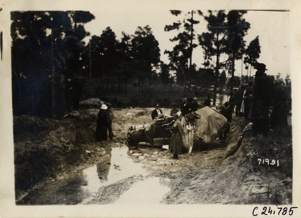 View of men and women looking at damaged Cunningham referee car in ditch during the 1911 Glidden Tour. Chairman Samuel M. Butler was killed in the crash. Stamped on back: "Spooner & Wells, Inc., photographers, telephones 3472-3473 Columbus, 1931 Broadway, New York." Handwritten on back: "Tours--Glidden Tour, 1911."