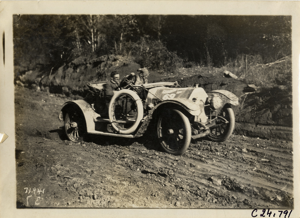 View of motorists in Oldsmobile Autocrat car no. 69 traveling on rural dirt road during the 1911 Glidden Tour. Stamped on back: "Spooner & Wells, Inc., photographers, telephones 3472-3473 Columbus, 1931 Broadway, New York." Handwritten on back: "Tours--Glidden Tour, 1911."