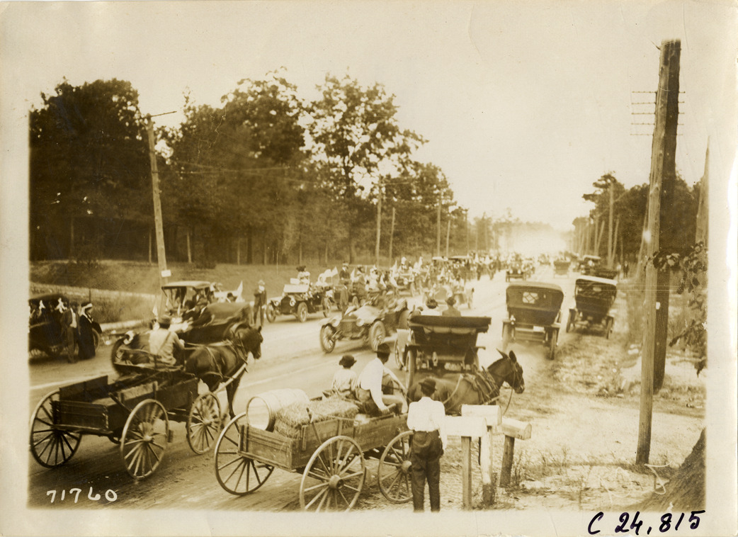 View of cars and horse-drawn wagons lined up in road during the 1911 Glidden Tour. Stamped on back: "Spooner & Wells, Inc., photographers, telephones 3472-3473 Columbus, 1931 Broadway, New York." Handwritten on back: "Tours--Glidden Tour, 1911."