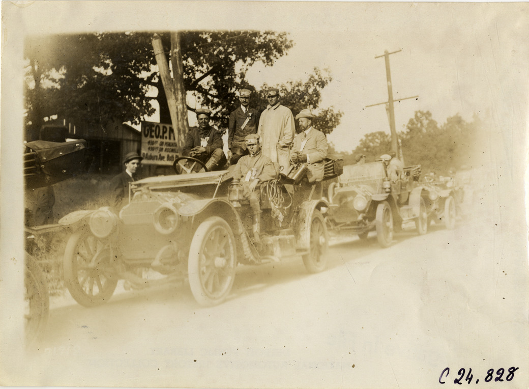 View of motorists in posing in car, followed closely by other cars, during the 1911 Glidden Tour. Stamped on back: "Spooner & Wells, Inc., photographers, telephones 3472-3473 Columbus, 1931 Broadway, New York." Handwritten on back: "Tours--Glidden Tour, 1911."