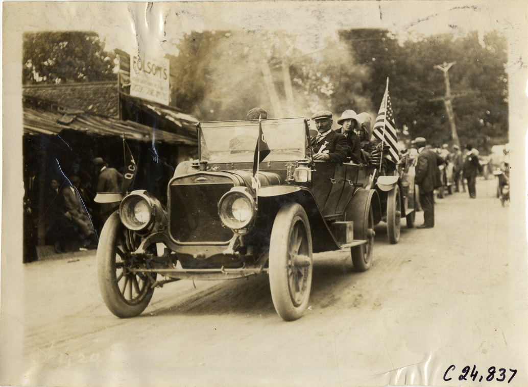 Motorists in automobile in front of Folsom's restaurant, 1911 Glidden Tour