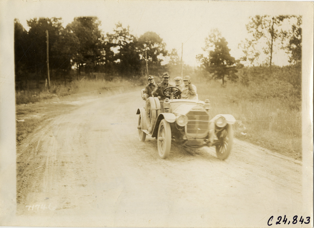 View of motorists in Maxwell car no. 1 traveling on rural dirt road during the 1911 Glidden Tour. Stamped on back: "Spooner & Wells, Inc., photographers, telephones 3472-3473 Columbus, 1931 Broadway, New York." Handwritten on back: "Tours--Glidden Tour, 1911."