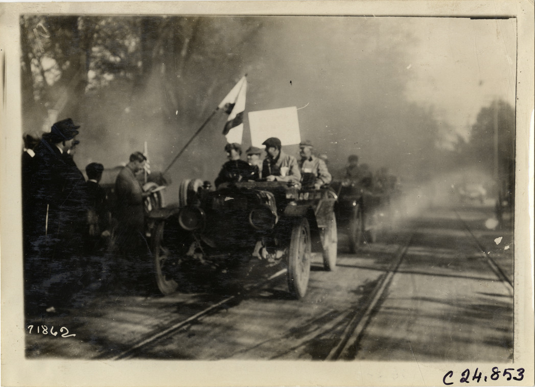 View of motorists in car, followed closely by other cars, during the 1911 Glidden Tour. Spectators watch from sidewalk. Stamped on back: "Spooner & Wells, Inc., photographers, telephones 3472-3473 Columbus, 1931 Broadway, New York." Handwritten on back: "Tours--Glidden Tour, 1911."