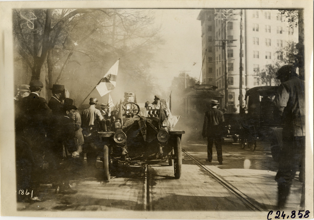 View of motorists in car, followed closely by other cars, during the 1911 Glidden Tour. Spectators watch from sidewalk; streetcar in background. Stamped on back: "Spooner & Wells, Inc., photographers, telephones 3472-3473 Columbus, 1931 Broadway, New York." Handwritten on back: "Tours--Glidden Tour, 1911."