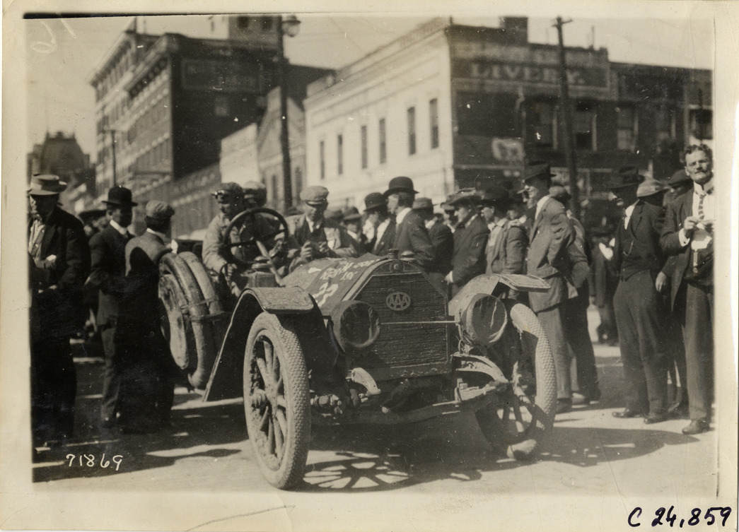 View of motorists in car no. 23, surrounded by spectators, at Macon, Georgia during the 1911 Glidden Tour. Hotel Lanier and other commercial buildings in background. Stamped on back: "Spooner & Wells, Inc., photographers, telephones 3472-3473 Columbus, 1931 Broadway, New York." Handwritten on back: "Tours--Glidden Tour, 1911."
