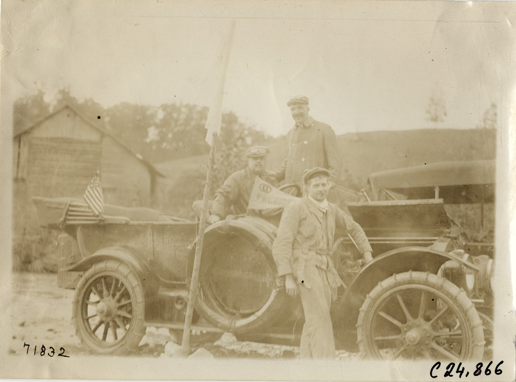 View of Charles J. Glidden and motorists posing with Garford President's car during the 1911 Glidden Tour. "President" pennant is displayed on car. Stamped on back: "Spooner & Wells, Inc., photographers, telephones 3472-3473 Columbus, 1931 Broadway, New York." Handwritten on back: "Tours--Glidden Tour, 1911."