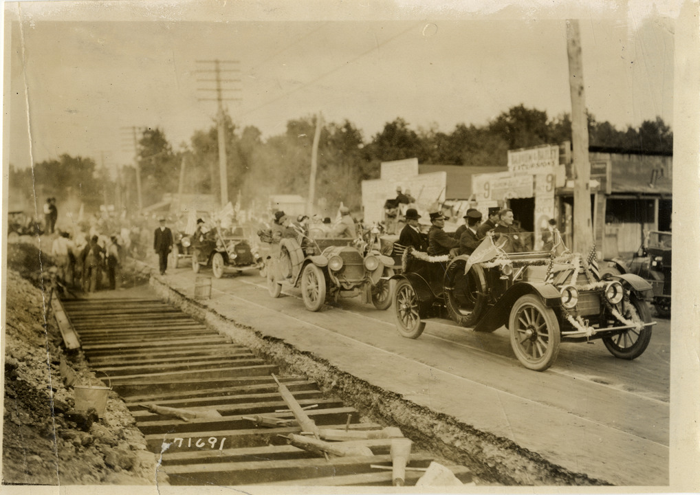 View of motorists in cars, decorated with flags and pennants, lined up in road during the 1911 Glidden Tour. Road construction in foreground; commercial buildings in background. Stamped on back: "Spooner & Wells, Inc., photographers, telephones 3472-3473 Columbus, 1931 Broadway, New York." Handwritten on back: "Tours--Glidden Tour, 1911."
