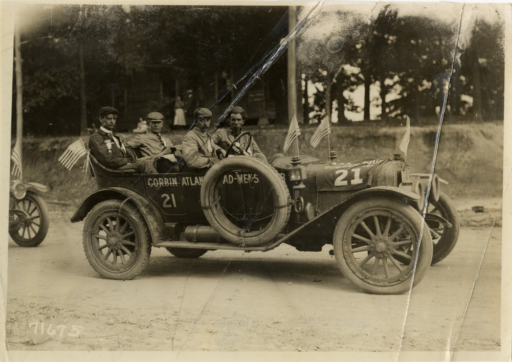 View of motorists posing in Corbin car no. 21 during the 1911 Glidden Tour. Car was entered by the Atlanta Ad Men's Club; car is decorated with small American flags. Stamped on back: "Spooner & Wells, Inc., photographers, telephones 3472-3473 Columbus, 1931 Broadway, New York." Handwritten on back: "Tours--Glidden Tour, 1911."