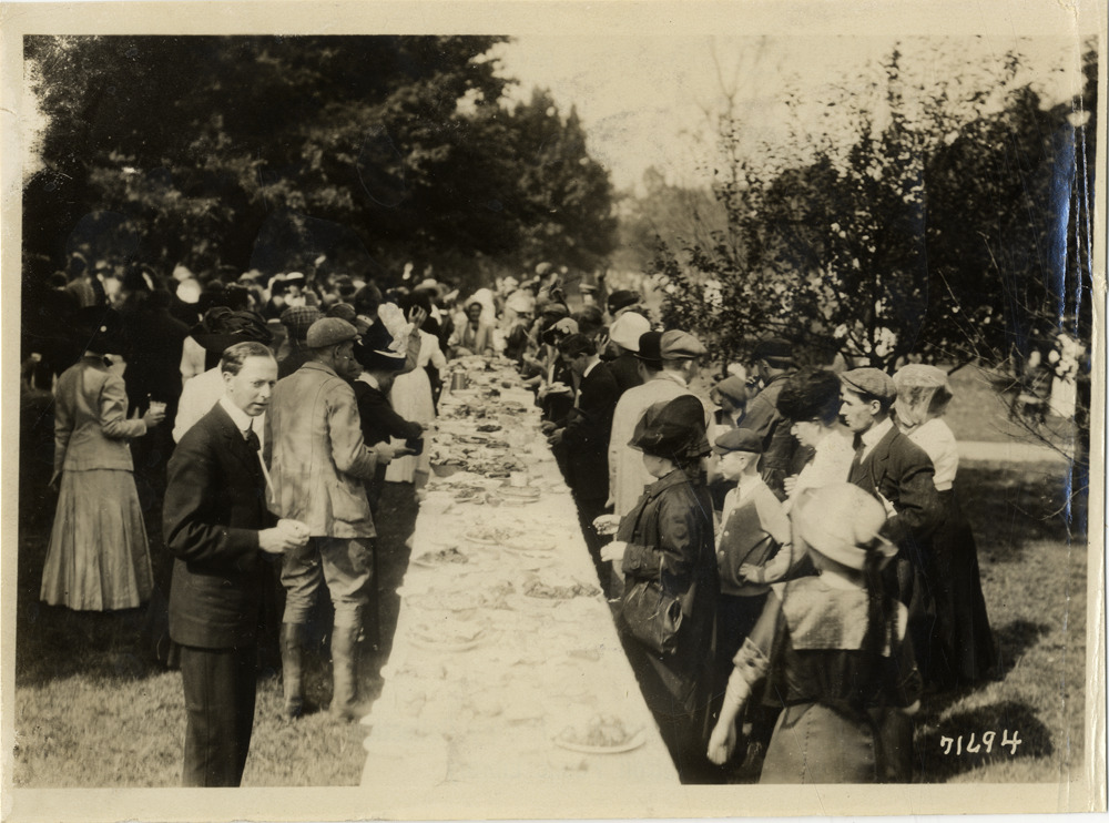View of men and women gathered around long table at picnic during the 1911 Glidden Tour. Stamped on back: "Spooner & Wells, Inc., photographers, telephones 3472-3473 Columbus, 1931 Broadway, New York." Handwritten on back: "Tours--Glidden Tour, 1911."