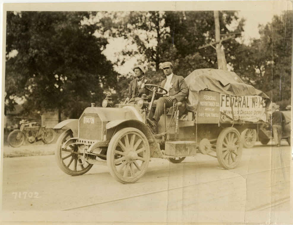 View of driver and passenger posing in Federal truck during the 1911 Glidden Tour. Banner on side of truck reads: "Federal no. 143, winner of Chicago, Detroit Reliability Run." Painted on side of truck: "Federal Motor Truck Co., mfrs. of one ton trucks." Stamped on back: "Spooner & Wells, Inc., photographers, telephones 3472-3473 Columbus, 1931 Broadway, New York." Handwritten on back: "Tours--Glidden Tour, 1911."