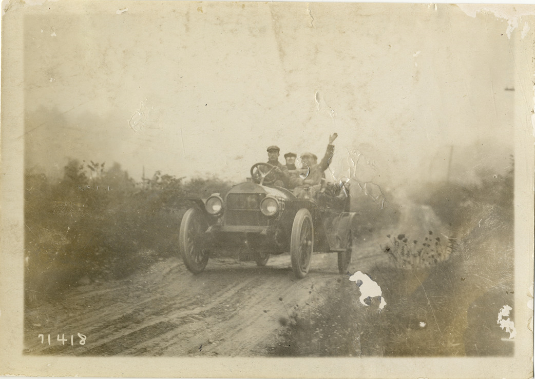 Motorists in Marathon automobile traveling on rural road, 1911 Glidden Tour