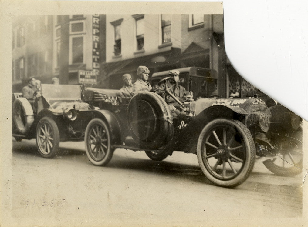 View of motorists in car, followed closely by another car, during the 1911 Glidden Tour. Commercial buildings in background. Stamped on back: "Spooner & Wells, Inc., photographers, telephones 3472-3473 Columbus, 1931 Broadway, New York." Handwritten on back: "Tours--Glidden Tour, 1911."