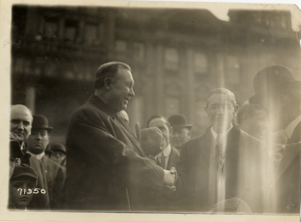 View of Governor Hoke Smith, of Georgia, shaking hands with Woodrow Wilson during the 1911 Glidden Tour. Wilson was governor of New Jersey. Stamped on back: "Spooner & Wells, Inc., photographers, telephones 3472-3473 Columbus, 1931 Broadway, New York." Handwritten on back: "Tours--Glidden Tour, 1911."