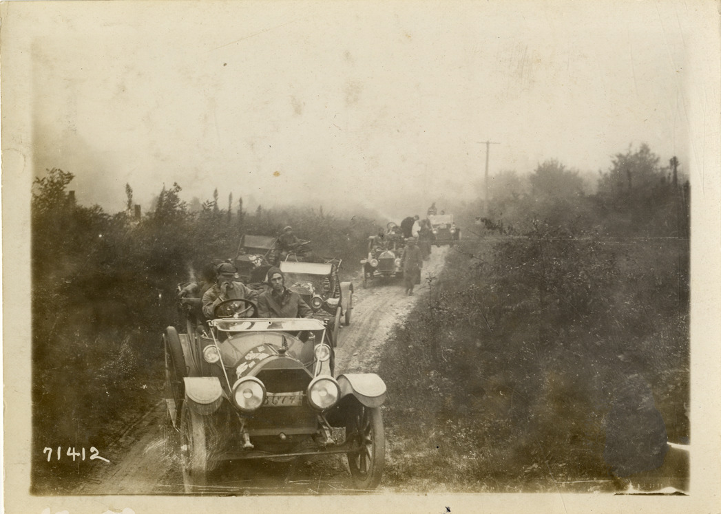 View of cars lined up on rural dirt road during the 1911 Glidden Tour. Cadillac car no. 48 in foreground. Stamped on back: "Spooner & Wells, Inc., photographers, telephones 3472-3473 Columbus, 1931 Broadway, New York." Handwritten on back: "Tours--Glidden Tour, 1911."