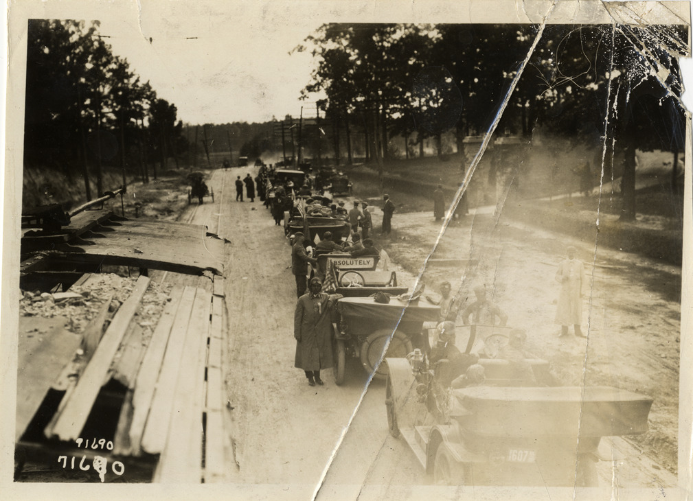 Rear view of motorists with cars lined up on dirt road during the 1911 Glidden Tour. Stamped on back: "Spooner & Wells, Inc., photographers, telephones 3472-3473 Columbus, 1931 Broadway, New York." Handwritten on back: "Tours--Glidden Tour, 1911."