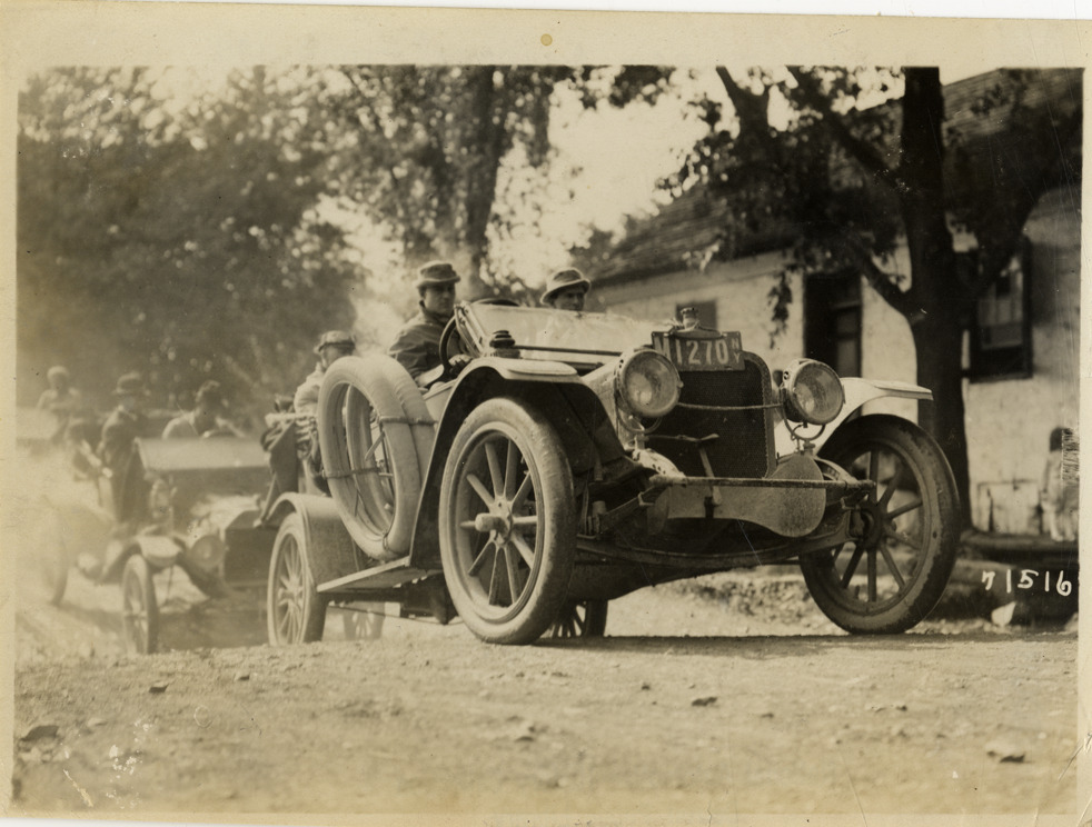 View of motorists in two cars crossing shallow drainage ditch in road during the 1911 Glidden Tour. Stone house in background. Stamped on back: "Spooner & Wells, Inc., photographers, telephones 3472-3473 Columbus, 1931 Broadway, New York." Handwritten on back: "Tours--Glidden Tour, 1911."