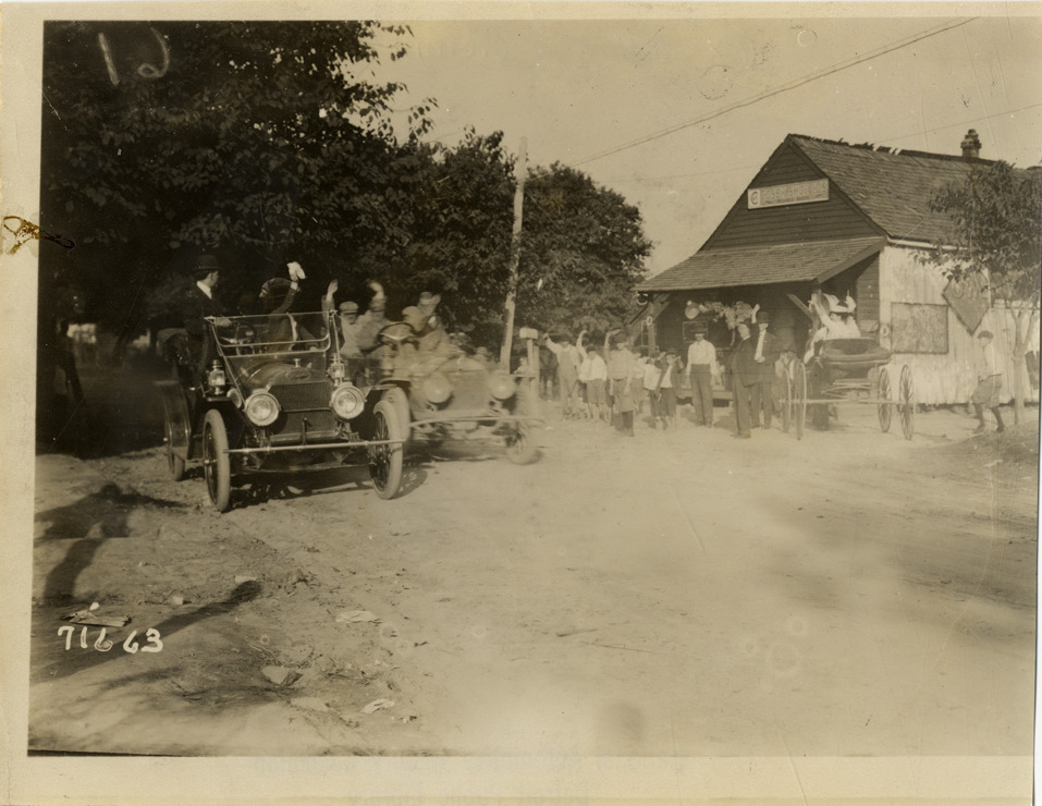 View of motorists in two cars parked next to rural store, waving at spectators, during the 1911 Glidden Tour. Horse-drawn carriage in front of store. Stamped on back: "Spooner & Wells, Inc., photographers, telephones 3472-3473 Columbus, 1931 Broadway, New York." Handwritten on back: "Tours--Glidden Tour, 1911."