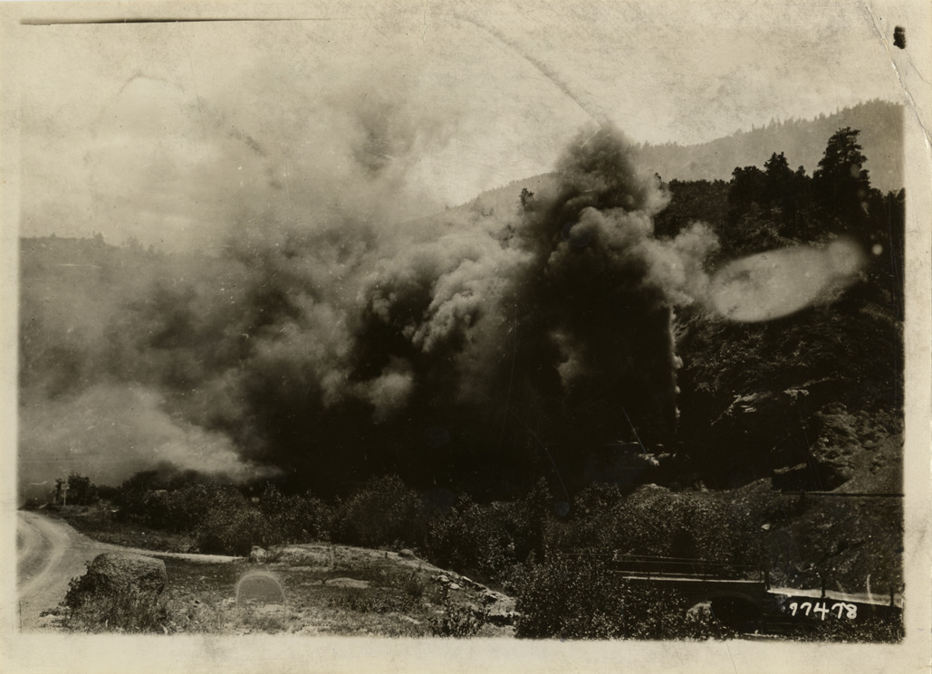 View of steam locomotive traveling on railroad tracks during the 1911 Glidden Tour. Smoke billows up from train. Stamped on back: "Spooner & Wells, Inc., photographers, 1931 Broadway, N.Y. City, phones 3472-3473 Col." Handwritten on back: "Tours--Glidden Tour, 1911."