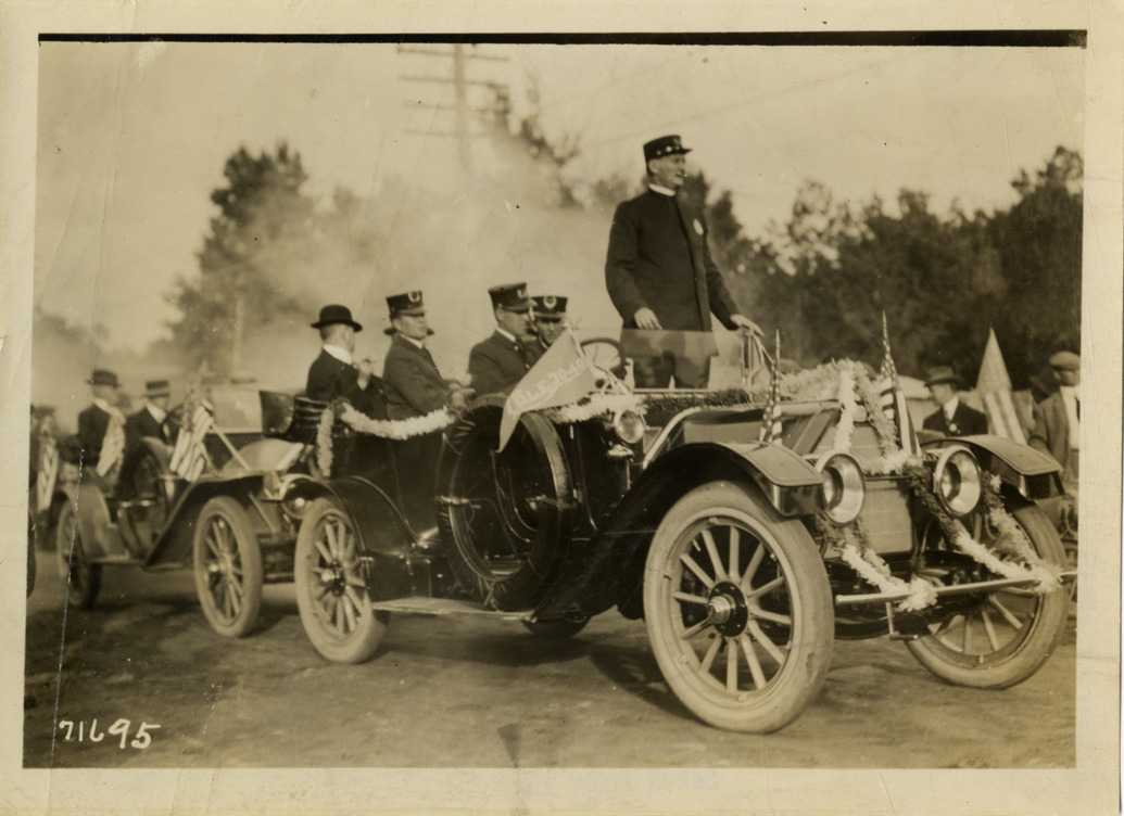 View of motorists in Cole car during the 1911 Glidden Tour. Car is decorated with garlands and small American flags. Stamped on back: "Spooner & Wells, Inc., photographers, telephones 3472-3473 Columbus, 1931 Broadway, New York." Handwritten on back: "Tours--Glidden Tour, 1911."