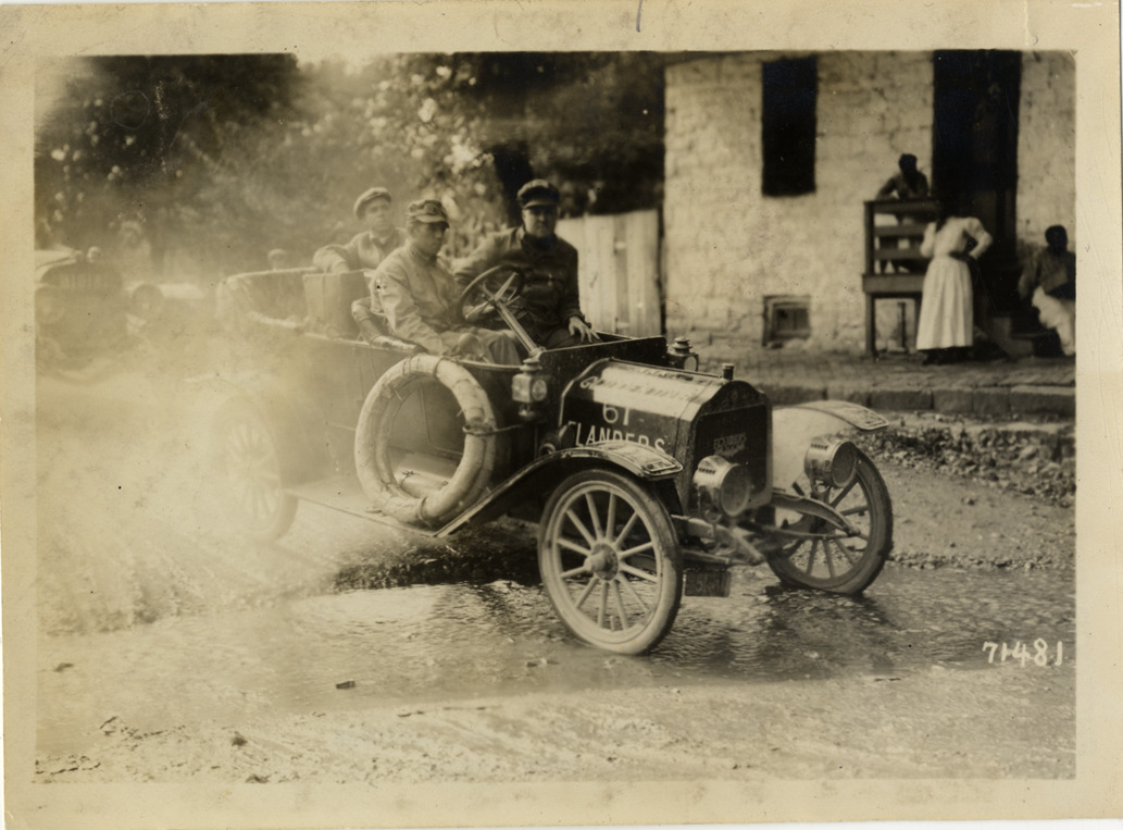 View of motorists in Flanders car no. 61 crossing shallow drainage ditch in road during the 1911 Glidden Tour. Stamped on back: "Spooner & Wells, Inc., photographers, telephones 3472-3473 Columbus, 1931 Broadway, New York." Handwritten on back: "Tours--Glidden Tour, 1911."