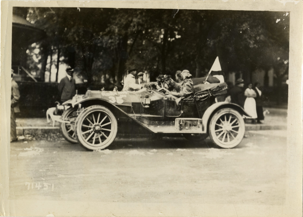 View of motorists in Halladay car no. 35 during the 1911 Glidden Tour. Stamped on back: "Spooner & Wells, Inc., photographers, telephones 3472-3473 Columbus, 1931 Broadway, New York." Handwritten on back: "Tours--Glidden Tour, 1911."
