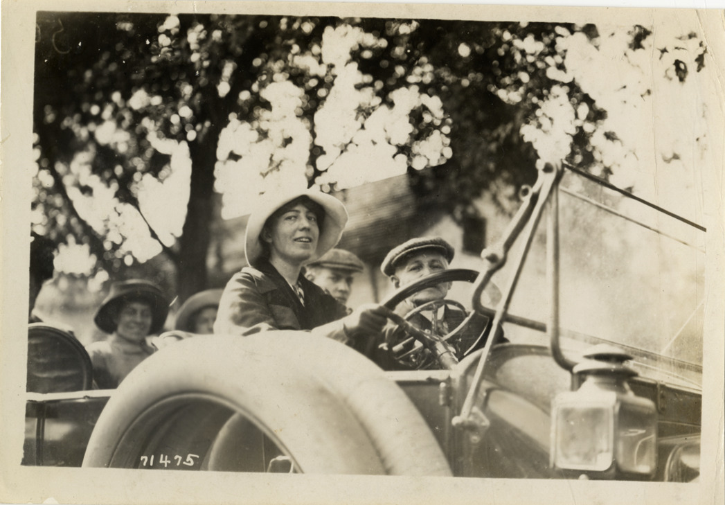 Close-up view of woman driving car during the 1911 Glidden Tour. Stamped on back: "Spooner & Wells, Inc., photographers, telephones 3472-3473 Columbus, 1931 Broadway, New York." Handwritten on back: "Tours--Glidden Tour, 1911."