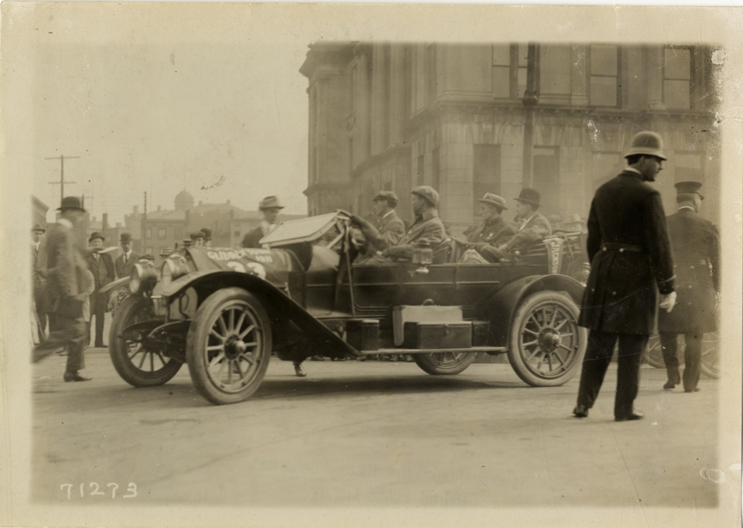View of motorists in Cole car no. 33 during the 1911 Glidden Tour. Policeman in foreground; spectators in background. Stamped on back: "Spooner & Wells, Inc., photographers, telephones 3472-3473 Columbus, 1931 Broadway, New York." Handwritten on back: "Tours--Glidden Tour, 1911."