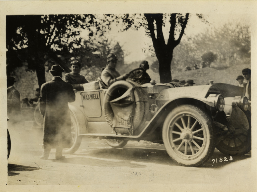 View of motorists in Maxwell car during the 1911 Glidden Tour. Man stands next to car; stone house and spectators in background. Stamped on back: "Spooner & Wells, Inc., photographers, telephones 3472-3473 Columbus, 1931 Broadway, New York." Handwritten on back: "Tours--Glidden Tour, 1911."