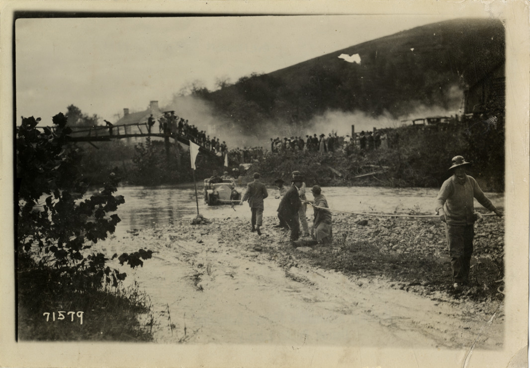 View of men with rope towing a car across Back Creek near Roanoke, Virginia during the 1911 Glidden Tour. Spectators and pedestrian footbridge in background. Stamped on back: "Spooner & Wells, Inc., photographers, telephones 3472-3473 Columbus, 1931 Broadway, New York." Handwritten on back: "Tours--Glidden Tour, 1911."