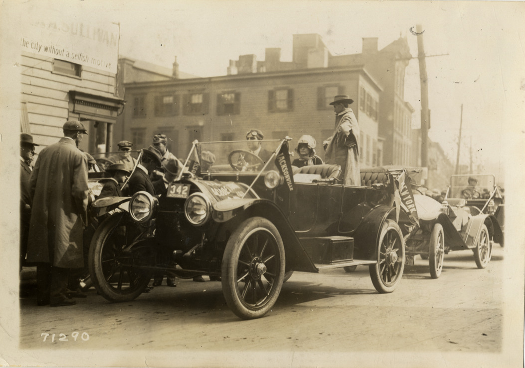 View of motorists in car, followed closely by other cars, during the 1911 Glidden Tour. Spectators and buildings in background. Stamped on back: "Spooner & Wells, Inc., photographers, telephones 3472-3473 Columbus, 1931 Broadway, New York." Handwritten on back: "Tours--Glidden Tour, 1911."