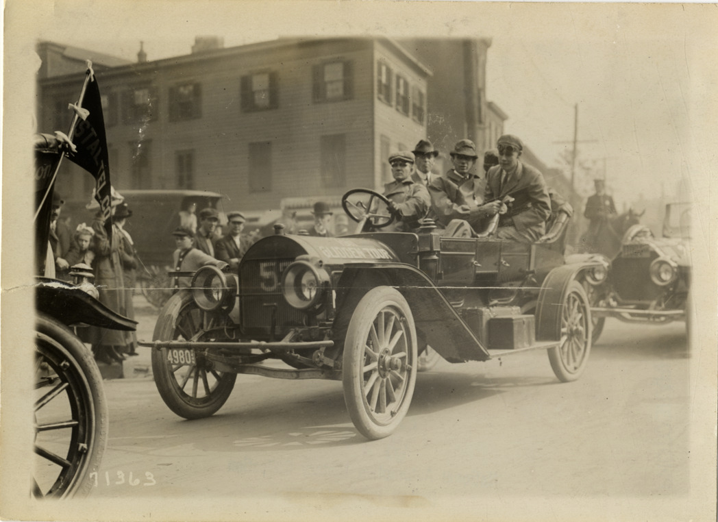 View of motorists posing in Marathon car no. 57 during the 1911 Glidden Tour. Stamped on back: "Spooner & Wells, Inc., photographers, telephones 3472-3473 Columbus, 1931 Broadway, New York." Handwritten on back: "Tours--Glidden Tour, 1911."